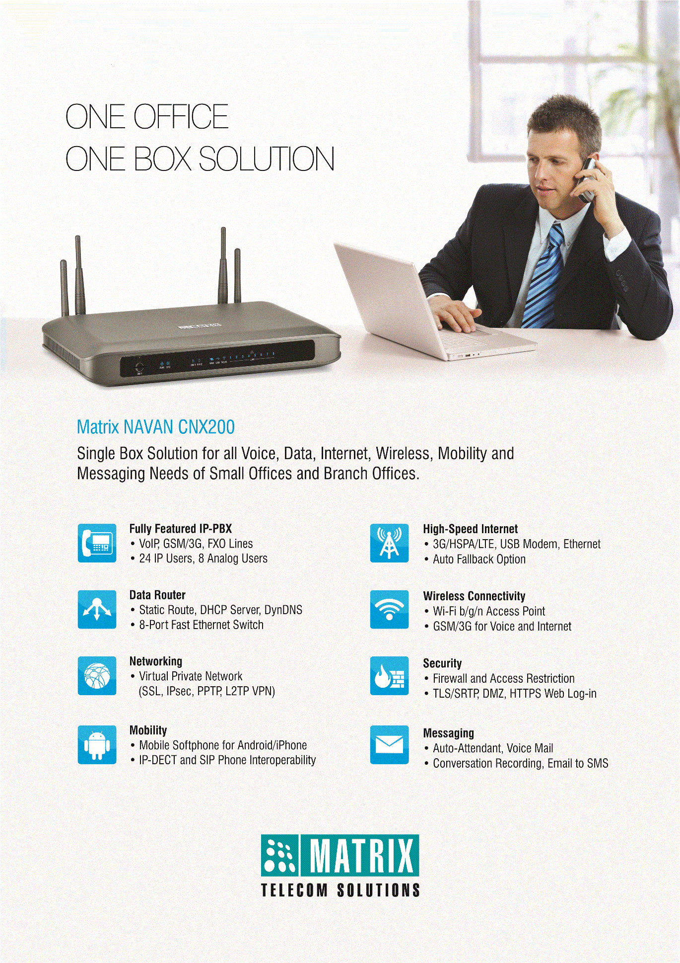 Matrix Data-Voice-Messaging Convergence combines the functionalities of a Data Router, Firewall, Wi-Fi Access Point, LAN Switch, IP-PBX, VPN Tunneling, GSM FCT, Analog PBX and a lot more from a single device. Matrix NAVAN CNX200 is a single box solution offering Business-class IP Telephony, Wireless Connectivity, Workplace Mobility, Internet Accessibility and Remote Site Connectivity. This converged solution is gaining prominence because all these features are available upon installation of a compact and an elegant single box.